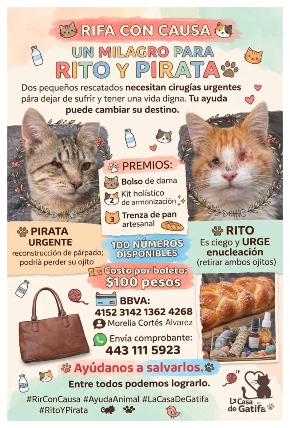 En un llamado que toca las fibras más profundas de la sensibilidad social, La Casa de Gatifa, encabezada por la activista Morelia Cortés Álvarez, solicitó el respaldo ciudadano para participar en una rifa con causa destinada a cubrir cirugías urgentes de dos gatitos: Rito y Pirata, quienes enfrentan condiciones críticas en sus ojitos.