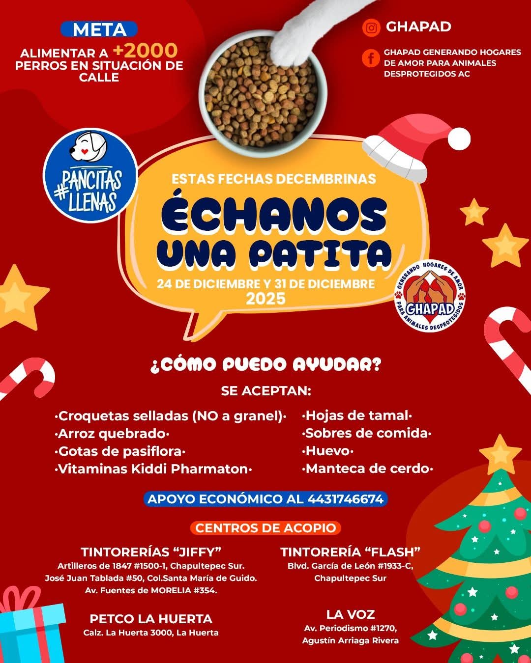 La urgencia se intensifica porque GHAPAD está a punto de realizar la onceava edición de su programa anual “Pancitas Llenas”, mediante el cual se brindará alimento a más de 5 mil perros, gatos, incluso aves y equinos durante Navidad y Año Nuevo.