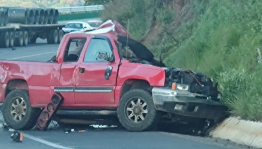 Tras el impacto, la camioneta pickup de color rojo, la cual quedó destrozada y sus ocupantes salieron disparados, quedando tirados sobre la carpeta asfáltica.