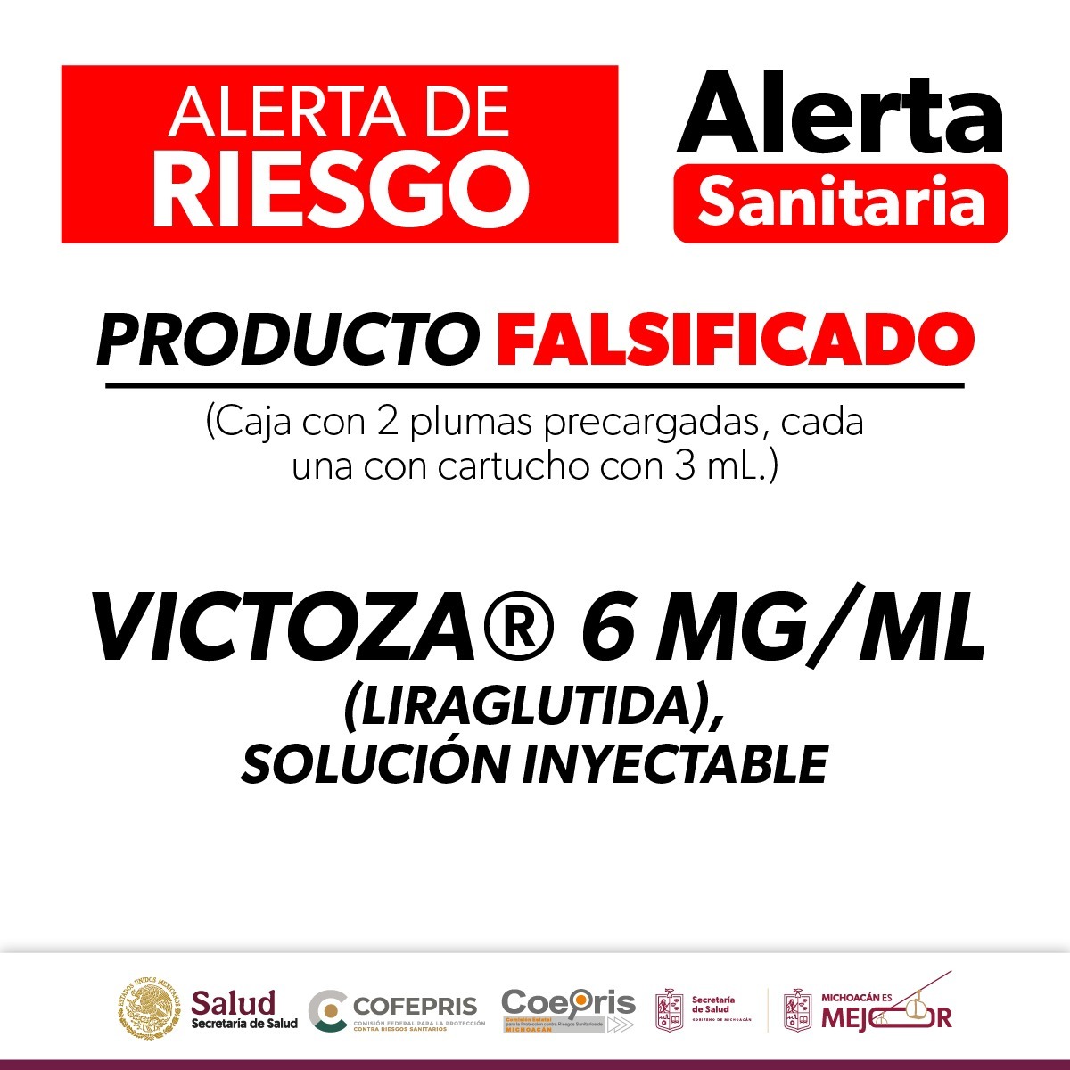 La Comisión Federal para la Protección contra Riesgos Sanitarios (Cofepris), a través de la Secretaría de Salud de Michoacán (SSM), informa a la población sobre la alerta sanitaria emitida respecto a la falsificación del medicamento Victoza®️ 6 mg/mL (Liraglutida), solución inyectable en pluma precargada, usado para mejorar el control glucémico.