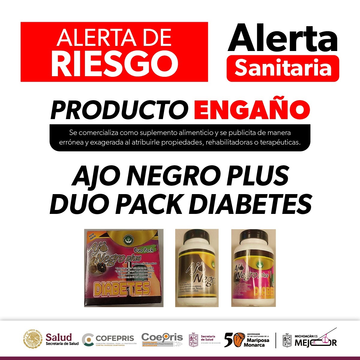La Comisión Federal para la Protección contra Riesgos Sanitarios (Cofepris) a través de la Secretaría de Salud de Michoacán (SSM), informa a la población en general sobre la emisión de dos alertas sanitarias relacionadas con los productos Ajo Negro Plus Duo Pack y suplementos Cinco Cerritos, que se comercializan de manera irregular y representan un riesgo para la salud pública.