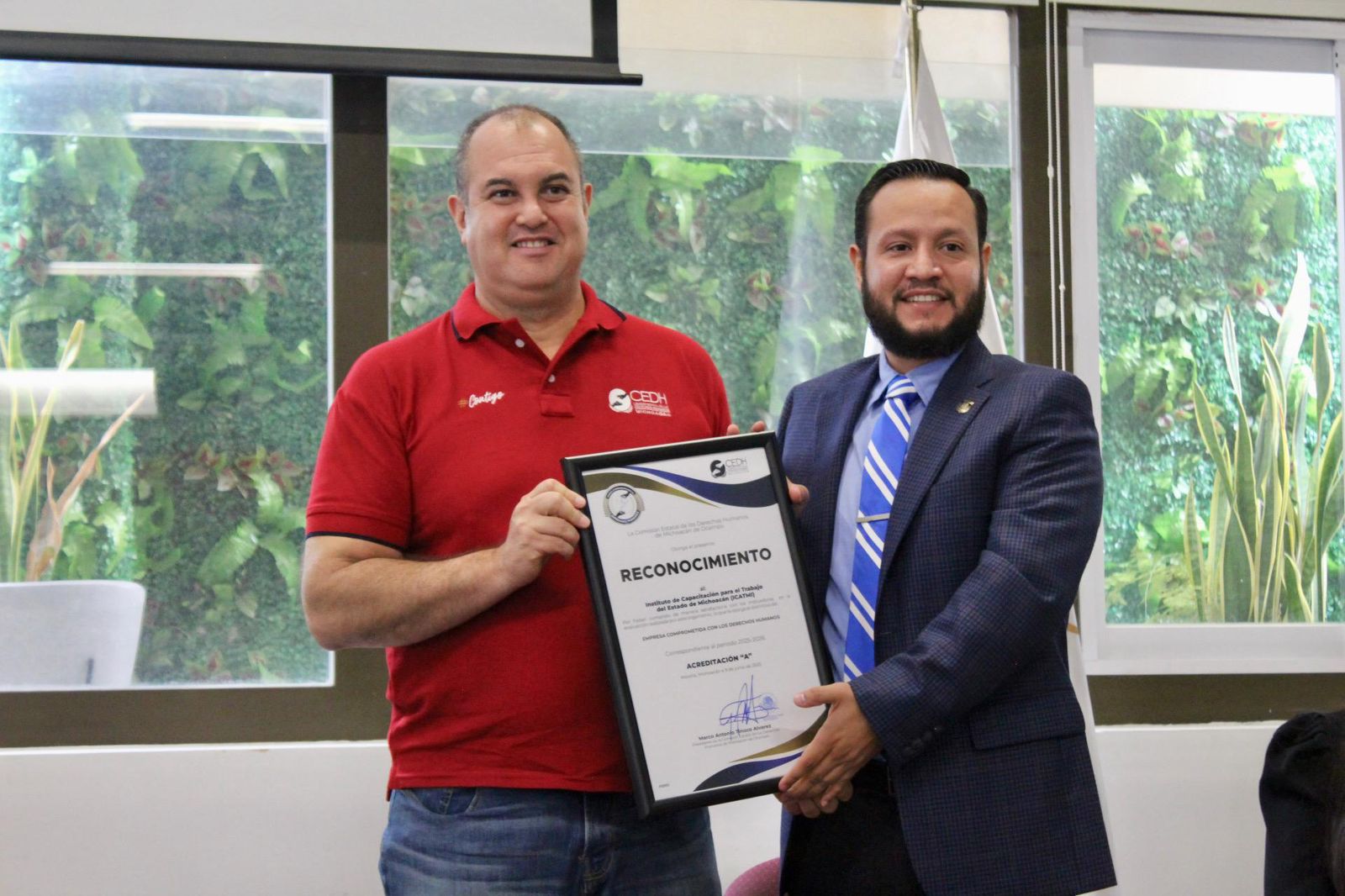 El distintivo fue entregado por el titular de la Comisión Estatal de Derechos Humanos (CEDH), Marco Antonio Tinoco Álvarez, al director general del Icatmi, Marco Antonio Flores de la Torre, luego de reconocer la labor que se lleva a cabo en dicho plantel, al mantener un modelo académico flexible, pertinente e incluyente hacia las personas con discapacidad.