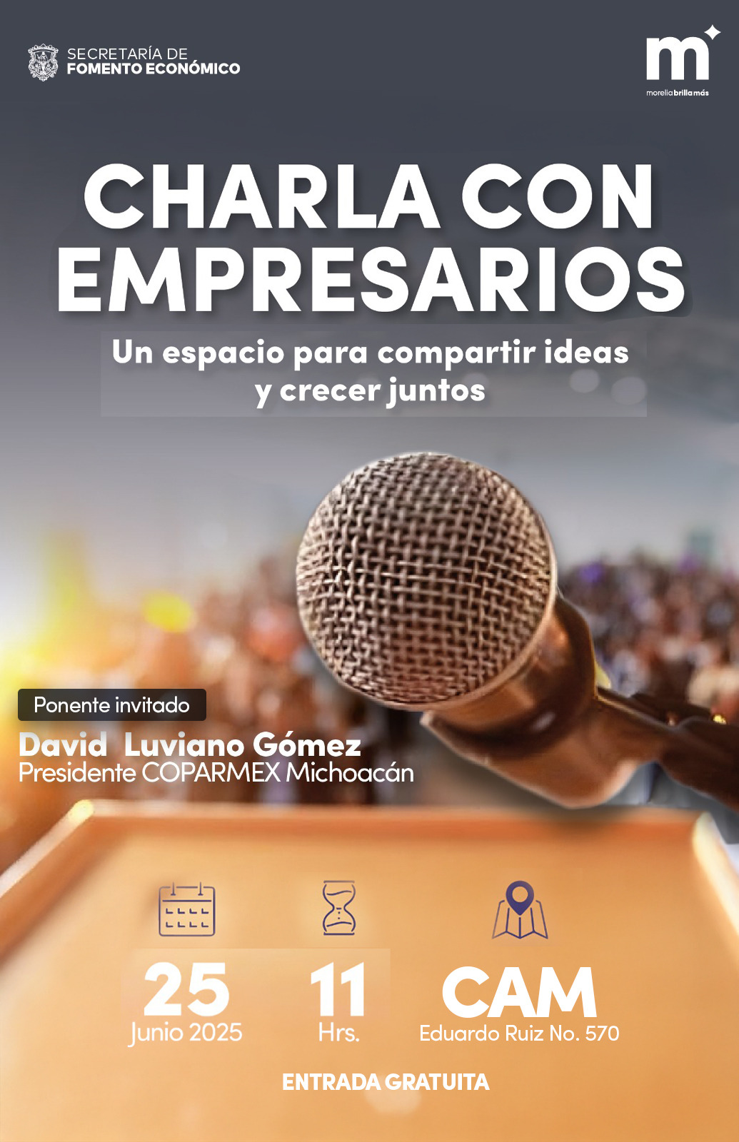 El presidente de la Confederación Patronal de la República Mexicana (Coparmex) en Michoacán, David Luviano Gómez, compartirá sus experiencias, retos y trayectoria para mantener empresas exitosas, en un encuentro directo y cercano con emprendedores el miércoles 25 de junio a las 11:00 horas, organizado por la Dirección de Emprendimiento e Innovación de la Secretaría de Fomento Económico (Sefeco).