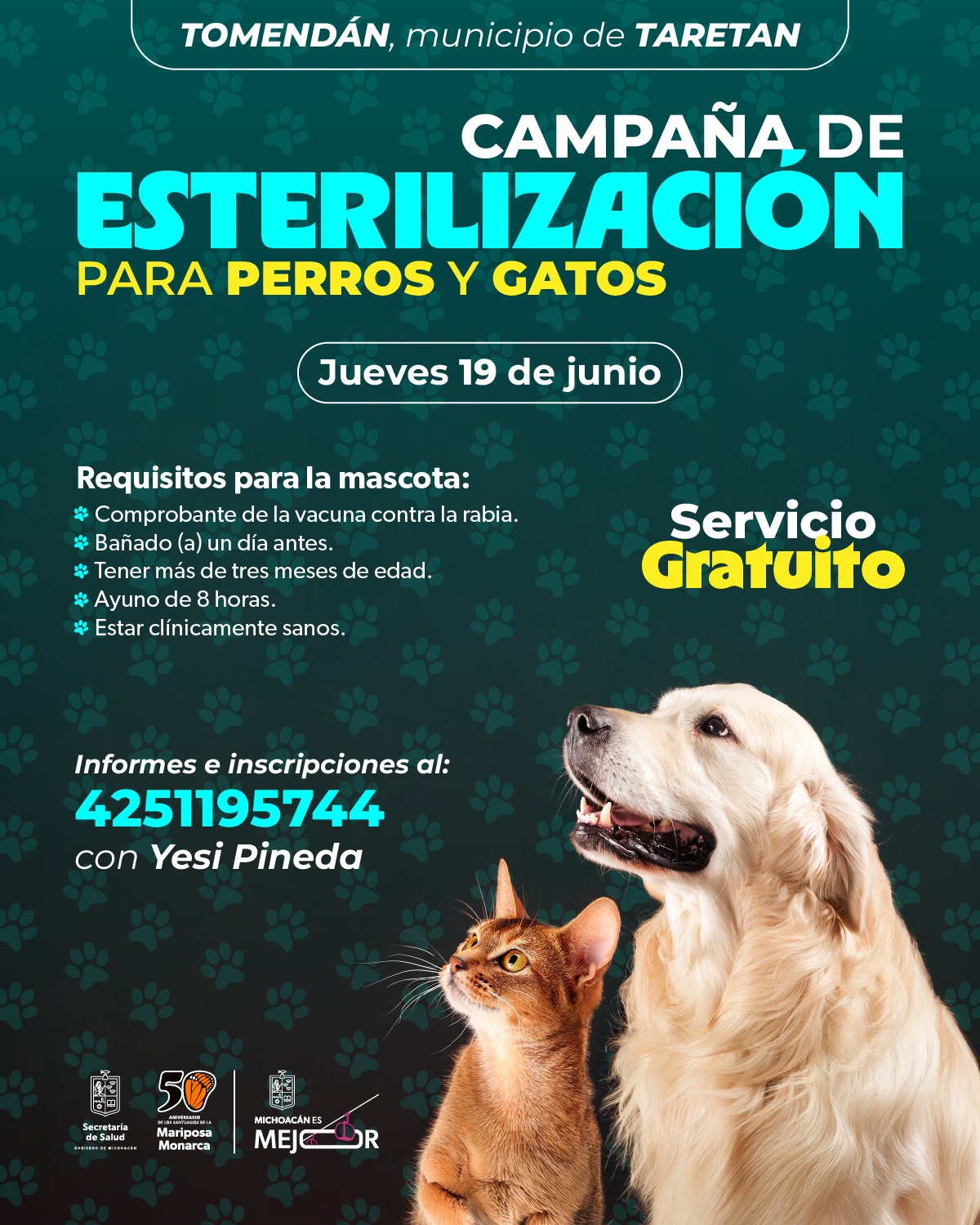 La Secretaría de Salud de Michoacán (SSM) informa que se llevará a cabo una campaña de esterilización gratuita para perros y gatos, con el objetivo de promover la salud animal y el control de la población de mascotas.
