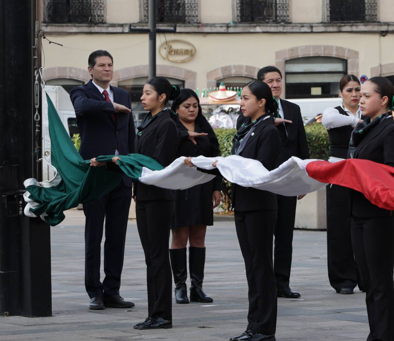 Acompañado por el gobernador Alfredo Ramírez Bedolla, encabezaron la ceremonia de izamiento de bandera a media asta en señal de luto en la Plaza Melchor Ocampo.