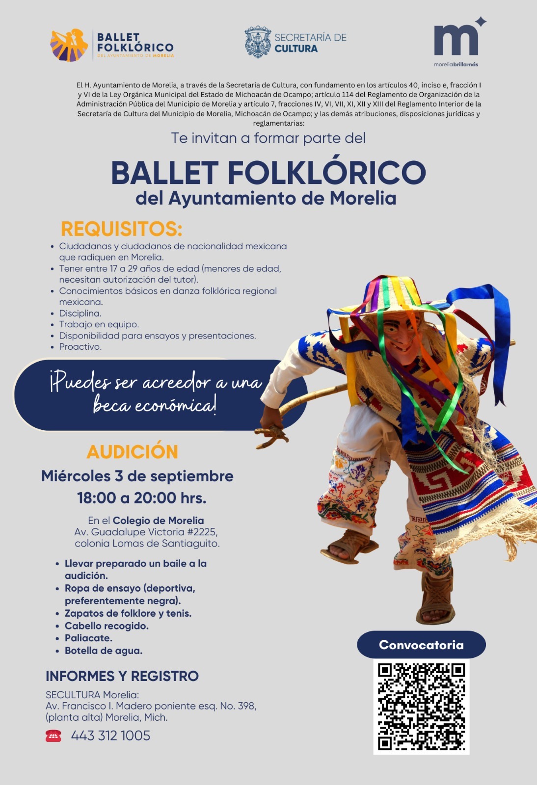 El Gobierno de Morelia que encabeza el presidente municipal, Alfonso Martínez Alcázar, por medio de su Secretaría de Cultura (SeCultura) invita a personas de entre 17 y 29 años a sumarse al Ballet Folklórico del Ayuntamiento, con el objetivo de la administración por promover y fomentar la cultura, las tradiciones mexicanas y la danza.